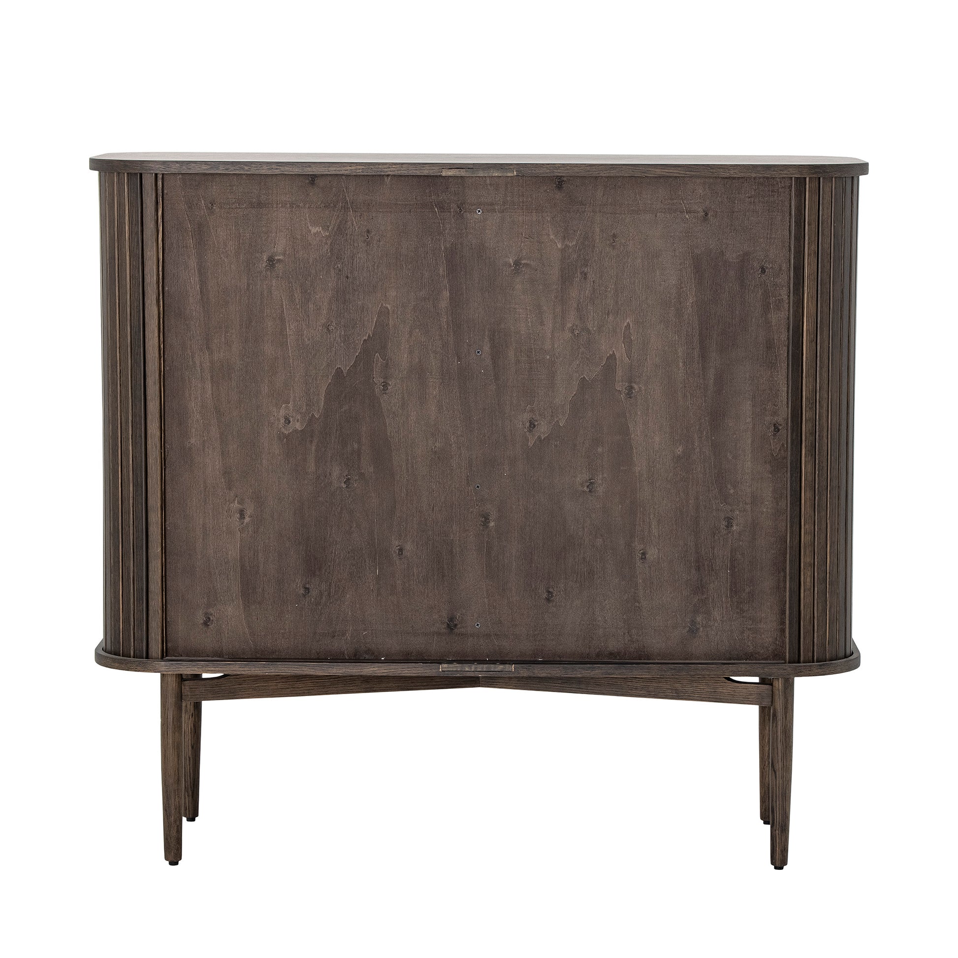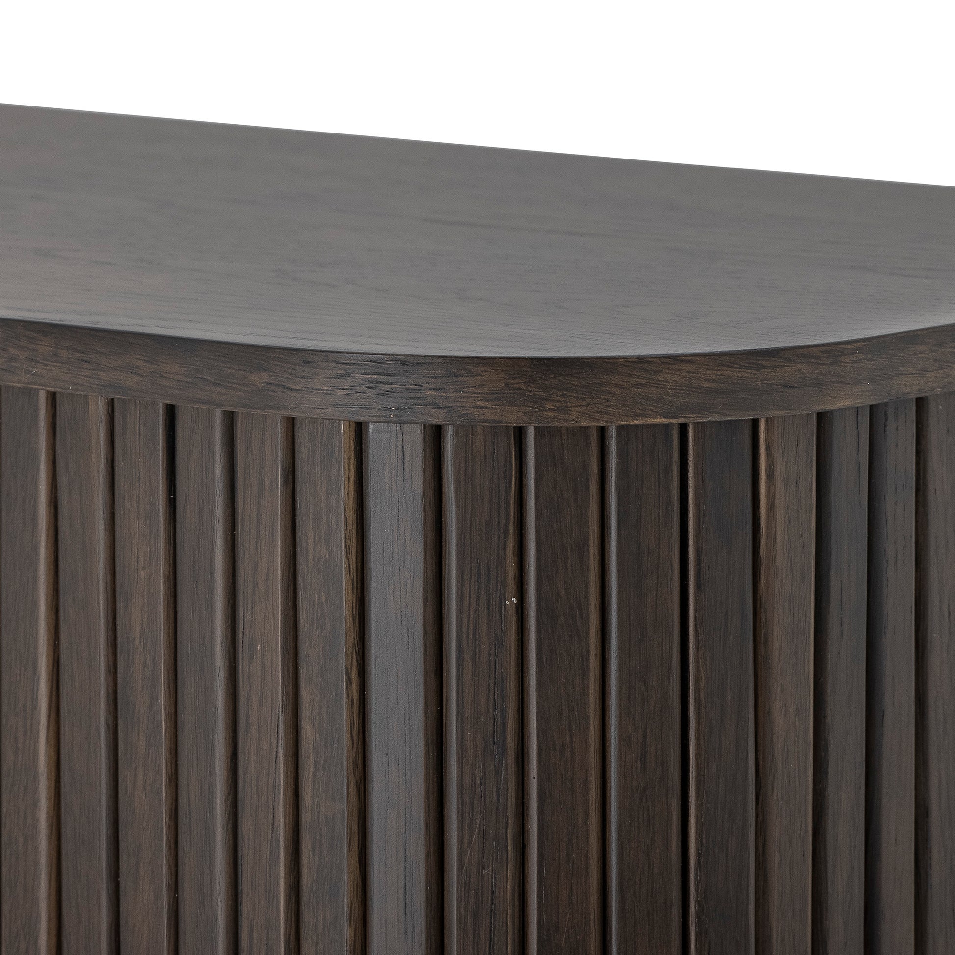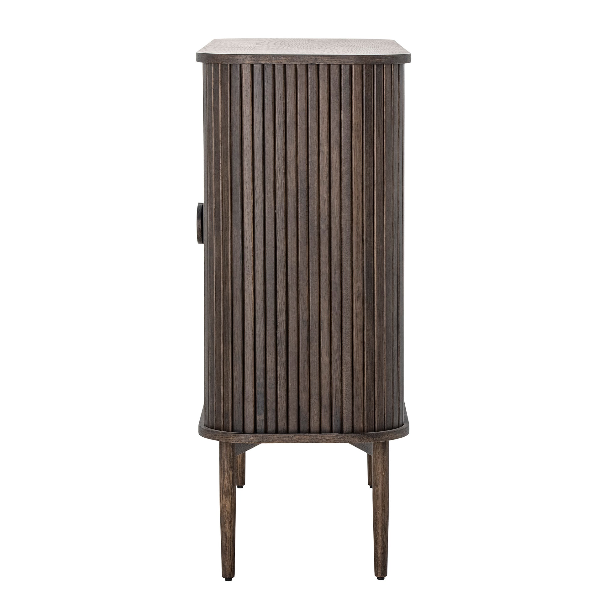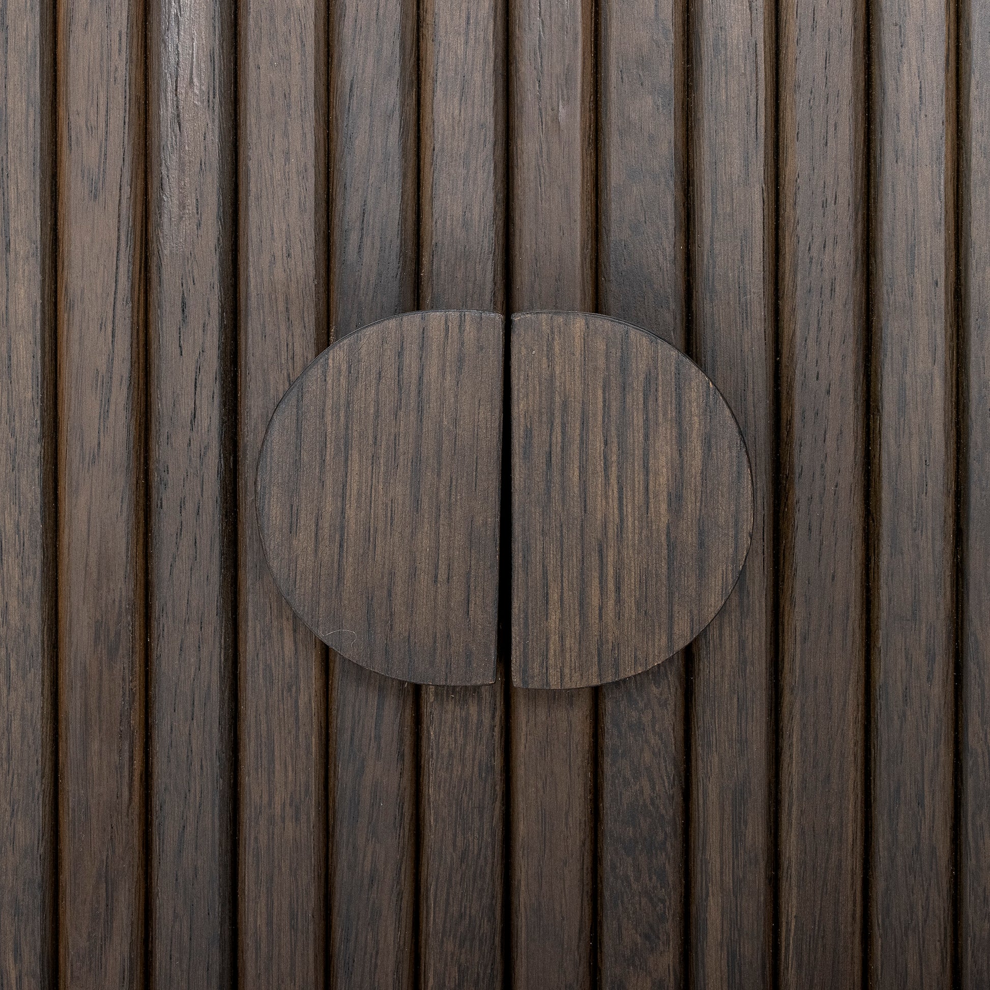 Elaria er et elegant oppbevaringsskap med et rolig og tidløst uttrykk. Det er laget i ekte eik med en mørk røkt finish som gir dybde og varme til rommet. De rene linjene og skyvedørene i lamellstil gir skapet et sofistikert og balansert preg, mens de avrundede håndtakene tilfører mykhet og håndverksfølelse.